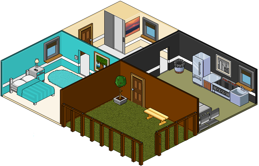 Its a lot of copy and paste. Try changing the habbo furniture so it has some uniqueness to it. Also, if it is an apartment, why is there grass and a gate? Loving the quilt cover though!