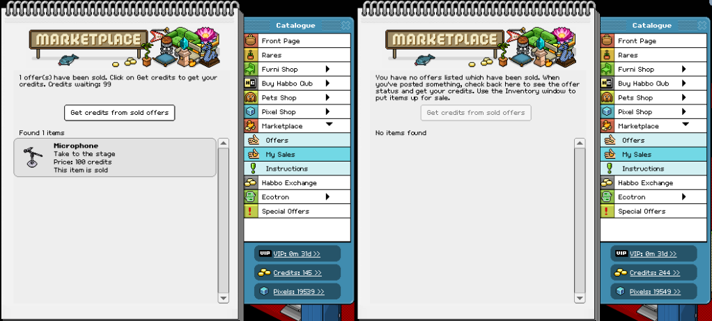 I sold my Britney microphone for 100 Credits [99 without commission] Don't know if anybody saw it on the Marketplace.