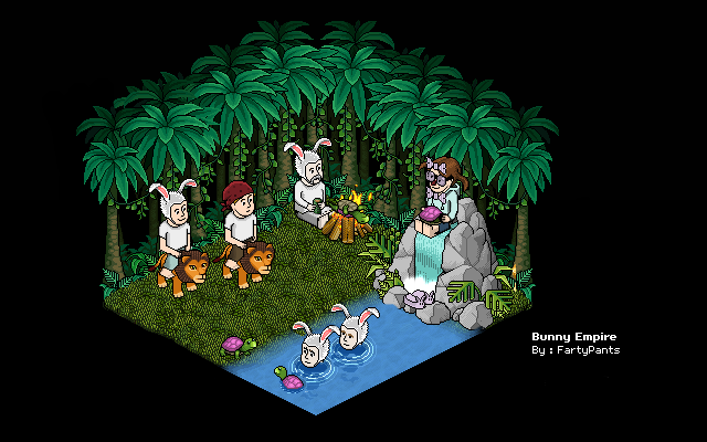 this is great for a first alt, the habbo sitting on the lions and also the waterfall looks great well done, I love how the turtles are on the fire and that persons lap! Well done amazing work+rep