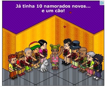 So, I went to a quiz site to host an event, and this is the advertise, in Portuguese, that shows a girl saying something like ''After unpacking my bags in Habbo Hotel, I already had 10 new boyfriends... and a dog!''