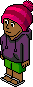 On habbo: Dark brown long hair (well it's not long but the one that sticks out at the bottom LMAO), a purple stripey tank top, black trousers and black sandals. (Slightly tanned, big eyes.. or w.e lol, and chubby cheeks)
