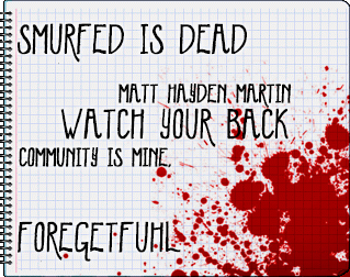Smurfed-'s body lays limply on the pavement, blood slowly trickling from the hole where his heart used to be, staining the cold stone underneath.
