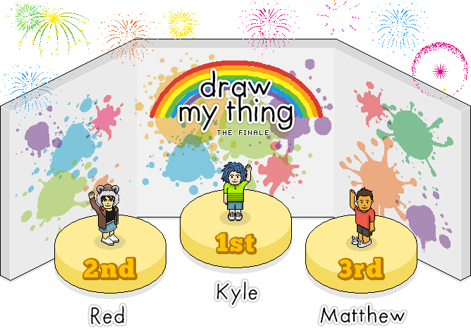 Hey Habbox! After two weeks of drawing and guessing, we are now at the finale of Draw My Thing! Over the course of two weeks, we saw 59 players battling for the top spot on the leaderboard, and a total of 329 drawings being created (more if we include the rejected ones!). Even though most players faltered along the way, three persevered and came out on top, completing all 20 tasks and winning themselves some amazing prizes. Big congratulations to @Kyle;, @Red; and @Matthew;!