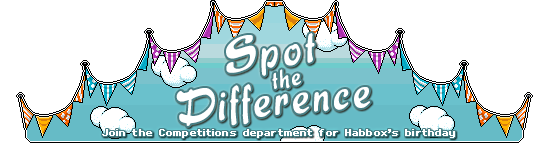 Everyday this week, a new password will be posted on this thread, as well as a link to a room. These go hand in hand as the password is for the room! Clever, that! When you enter the room, you will be presented with two Door Teleports, both leading you to nearly identical rooms. Each pair of rooms have 5 differences between them, and it is your job to find them, write them down and send your answers to HabboxComps.